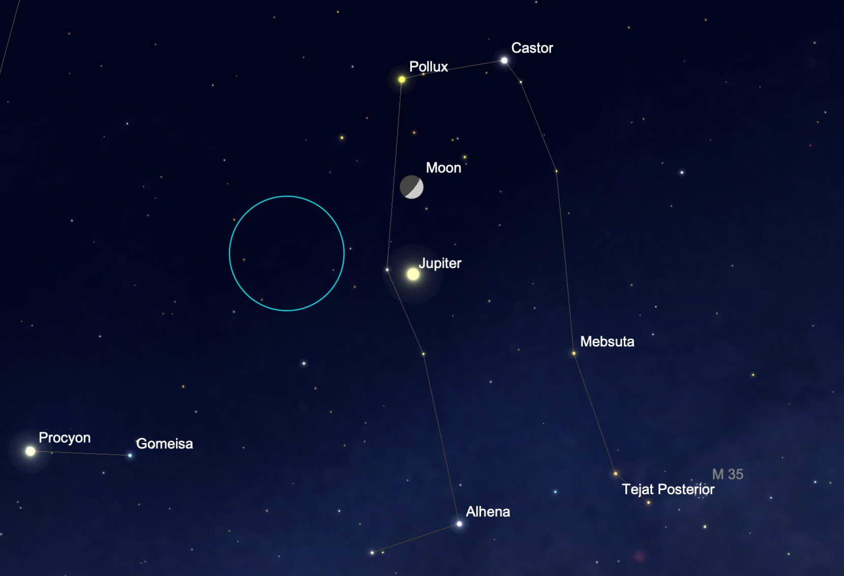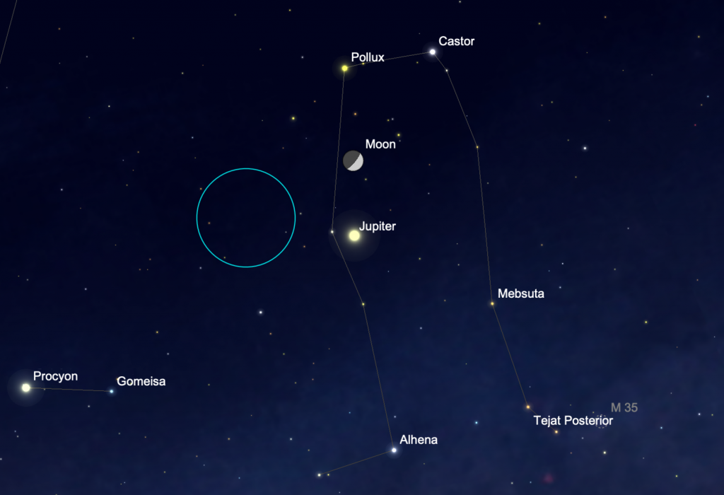 22 April. As the Moon continues along the ecliptic, tonight is lies in Gemini near Jupiter and the star Pollux. Tonight, magnitude -2.1 Jupiter lies just over a degree northwest of the star Wasat (Delta Gem). Over the next week, the planet moves closer to Wasat and passes about 35’ north of the star on April 30. The planet, its moons, and the star can fit into the same field of view in a telescope.