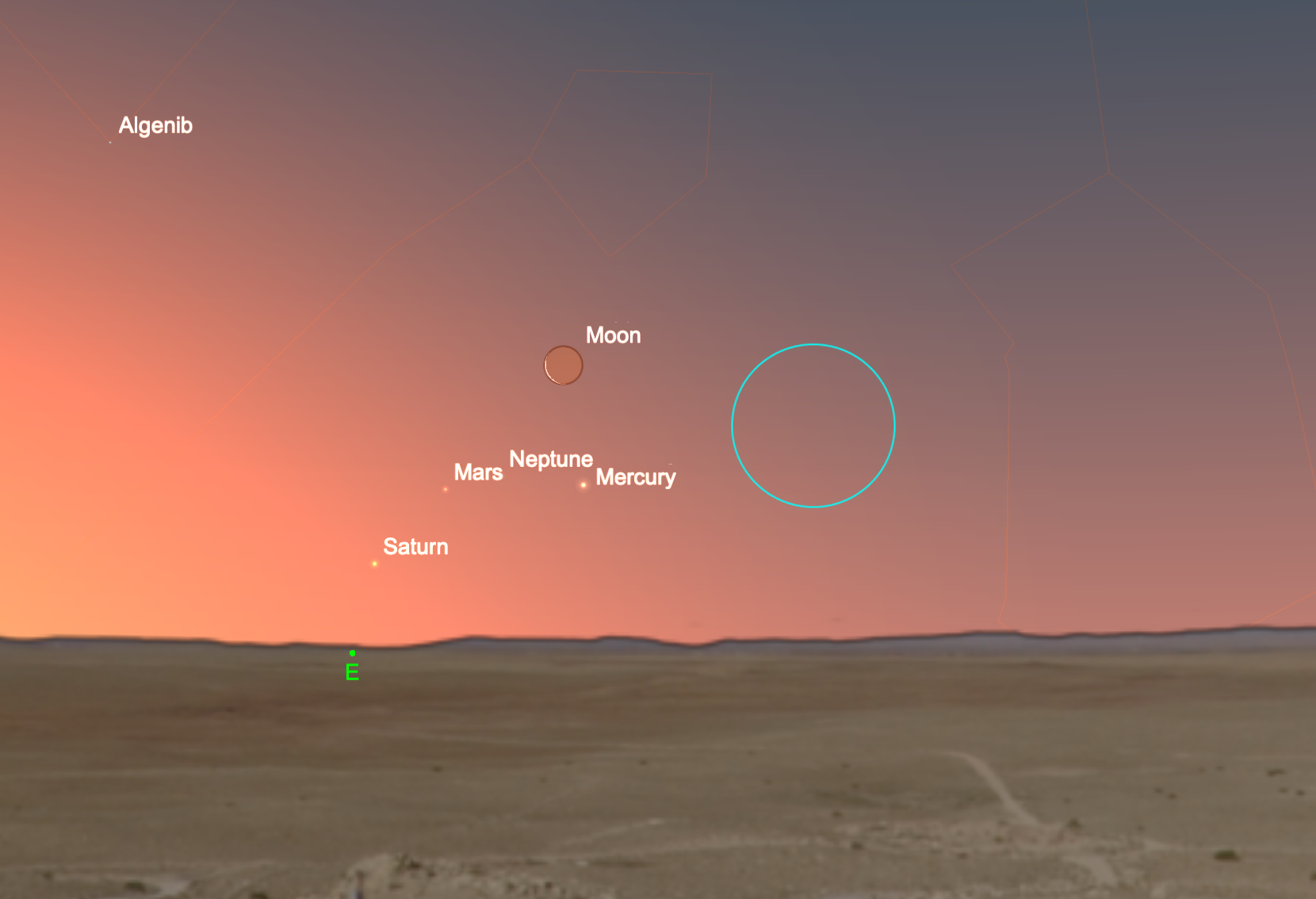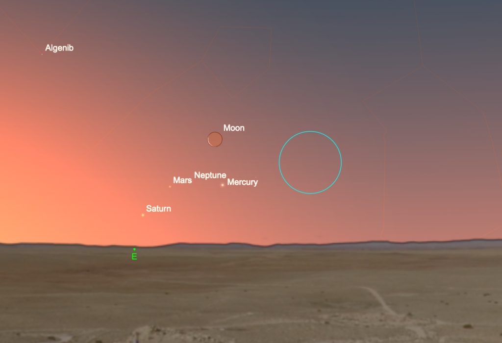 15 April. If you’re up early and you have an unobstructed view of the eastern horizon, grab your binoculars and look for Mercury, Mars, and a fading crescent Moon just over the horizon. Saturn and Neptune also lie in the area but are likely not visible in the brightening morning sky. The planets move about over the next week or so. This vista is a challenge for northern observers, but southern-hemisphere observers see the Moon and planets higher above the horizon during this apparition.