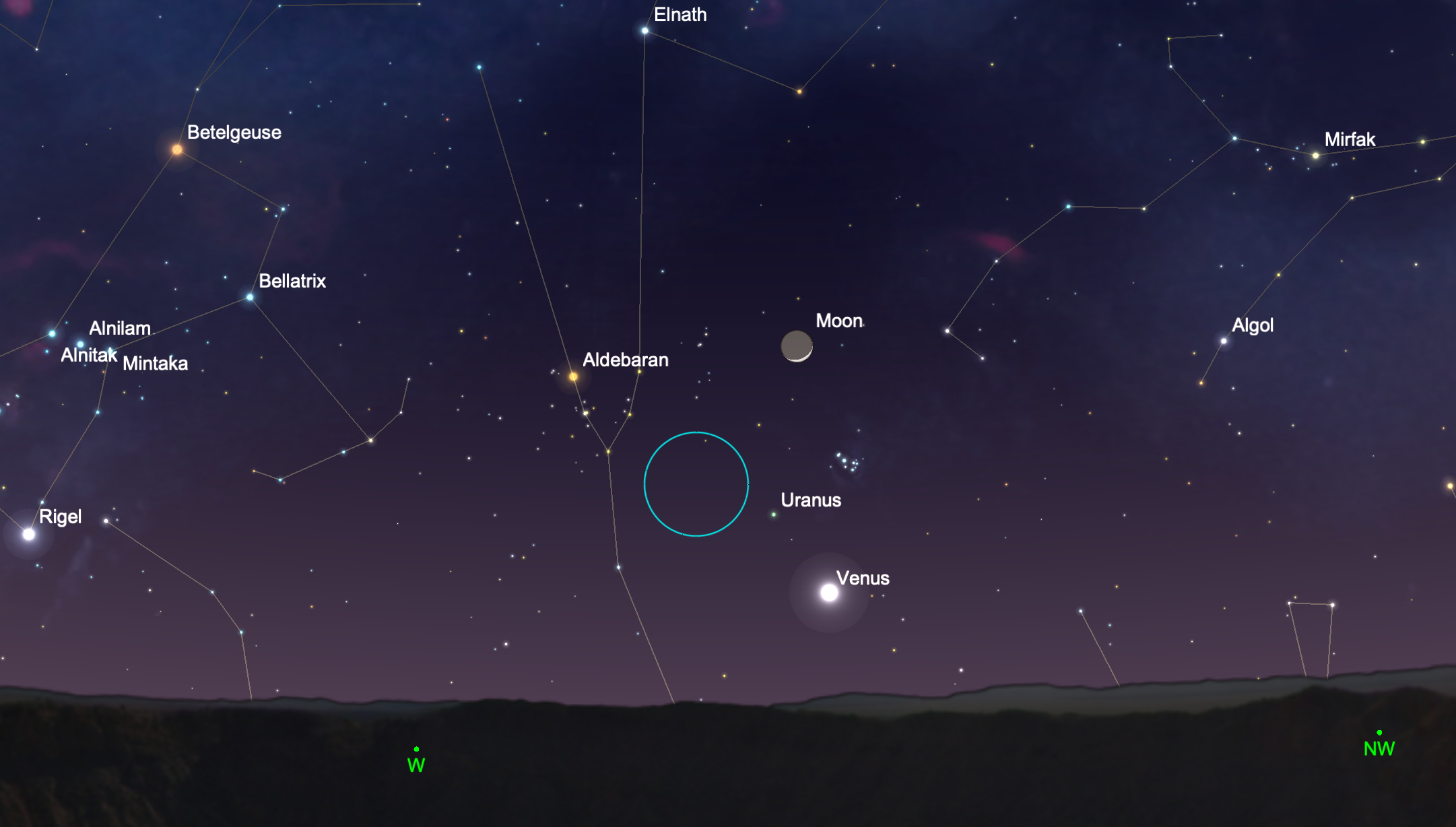 24 April. With a telescope, look for Uranus about 0.8o south of Venus in the western sky after sunset. Still at magnitude -3.9, Venus presents a disc nearly 90% illuminated and 11” across.